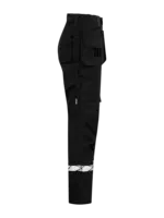 Damen Arbeitshose mit offenen Seitentaschen und extra breiten Gesässtaschen; die linke Gesässtasche ist mit Klappe und Magnetverschluss ausgestattet. Holstertaschen auf beiden Seiten für Werkzeuge, Stifte usw. Beintaschen: auf der linken Seite eine Tasche mit Klappe und Magnetverschluss, eine integrierte Handytasche und eine Halterung für den Ausweis. Auf der rechten Seite eine Tasche für den Zollstock und eine Werkzeugtasche mit Messerknopf. Knieschutztaschen, die von aussen per Reissverschluss zugänglich sind. Breitere Gürtelschlaufe hinten, um Druck durch den Gürtel zu vermeiden. Verdeckter Knopf vorne. Vorgeformte Knie, Stretch-Einsatz im Schritt und ein eingenähtes Stretchband im Bund für erhöhten Tragekomfort. Verstärkungen an der Zollstocktasche, den Gesässtaschen und über den Knien für erhöhte Haltbarkeit.